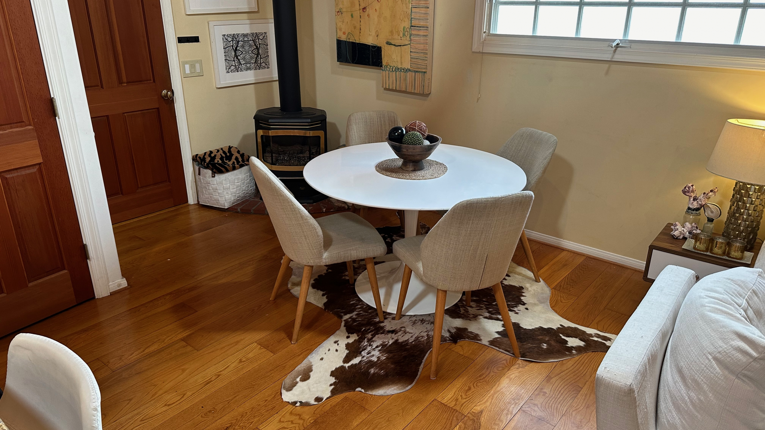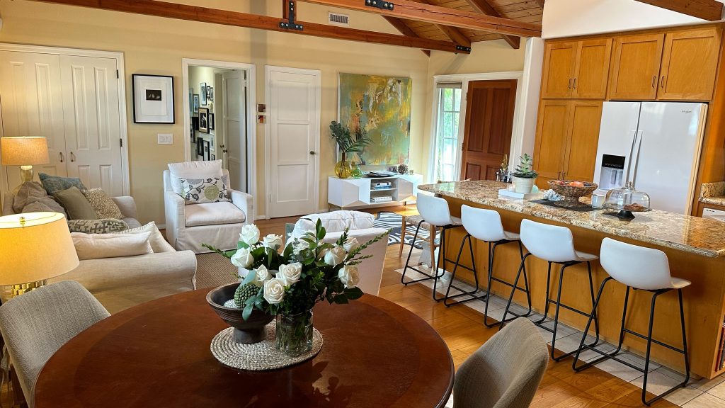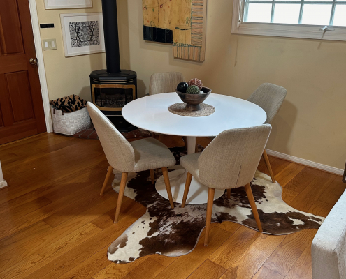 Adjacent to the kitchen and within the main room, you’ll find a cozy dining area with a four-person round table (actually accommodates six comfortably). The intimate setting is perfect for enjoying delicious meals with family and friends, or gathering for lively conversations and perhaps a table game or two, over a glass of wine.