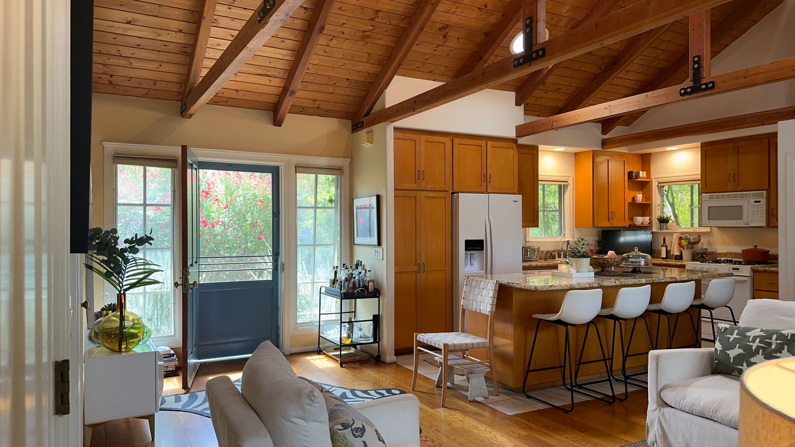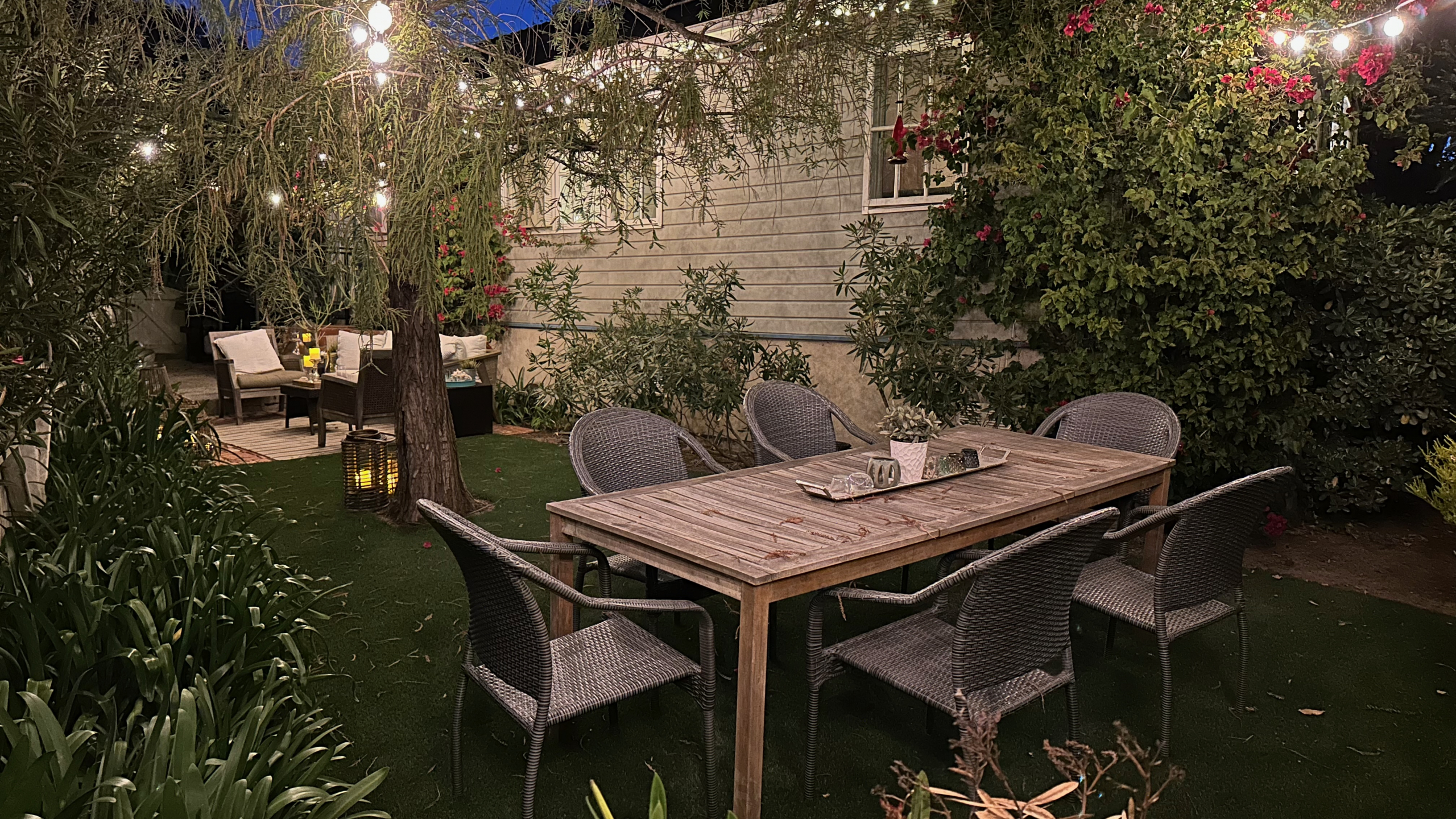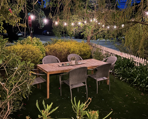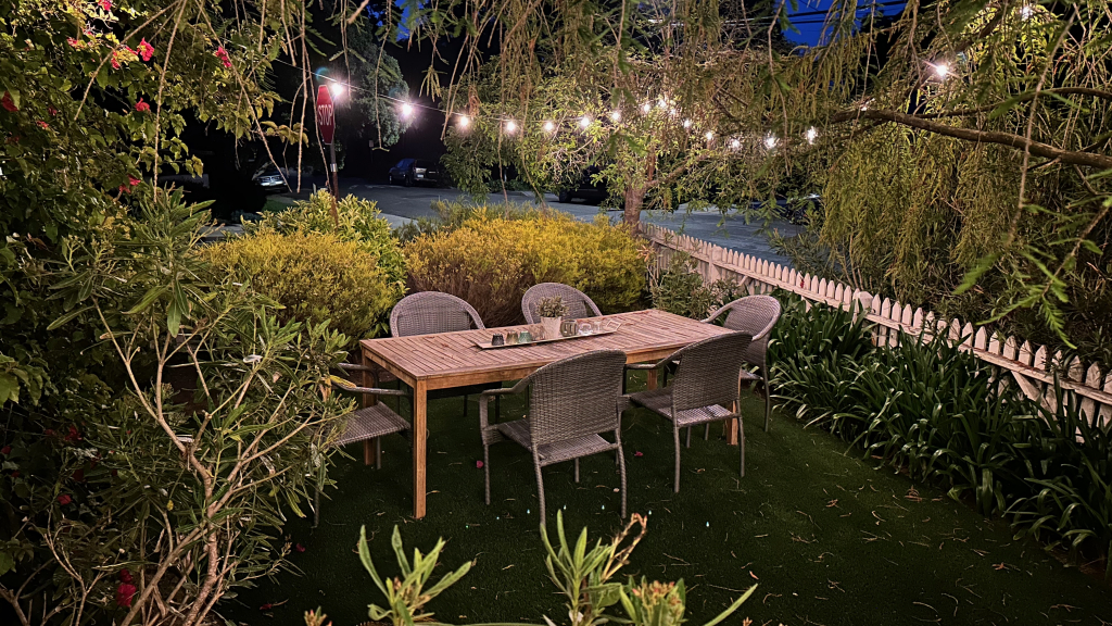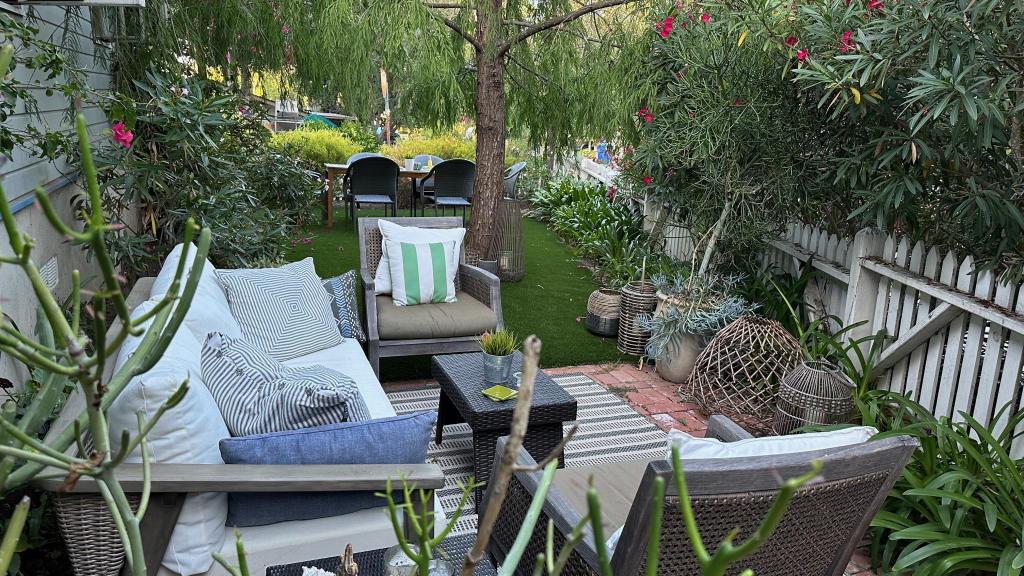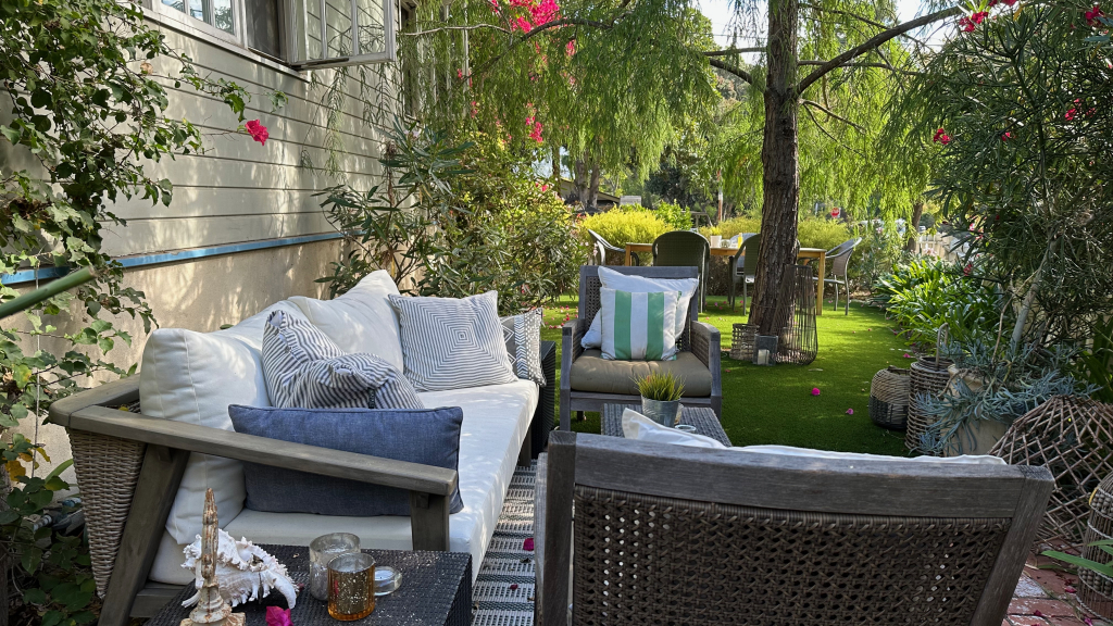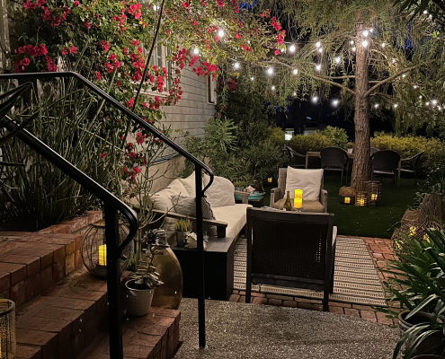 Step outside and discover a charming outdoor oasis that’s perfect for enjoying the beautiful Santa Barbara weather. The inviting seating area is adorned with comfortable furnishings and surrounded by lush greenery, creating a tranquil setting for al fresco dining or leisurely conversations under the stars. With strands of lightbulbs adding a touch of ambiance, this garden retreat is sure to be a favorite spot for relaxation and entertainment.