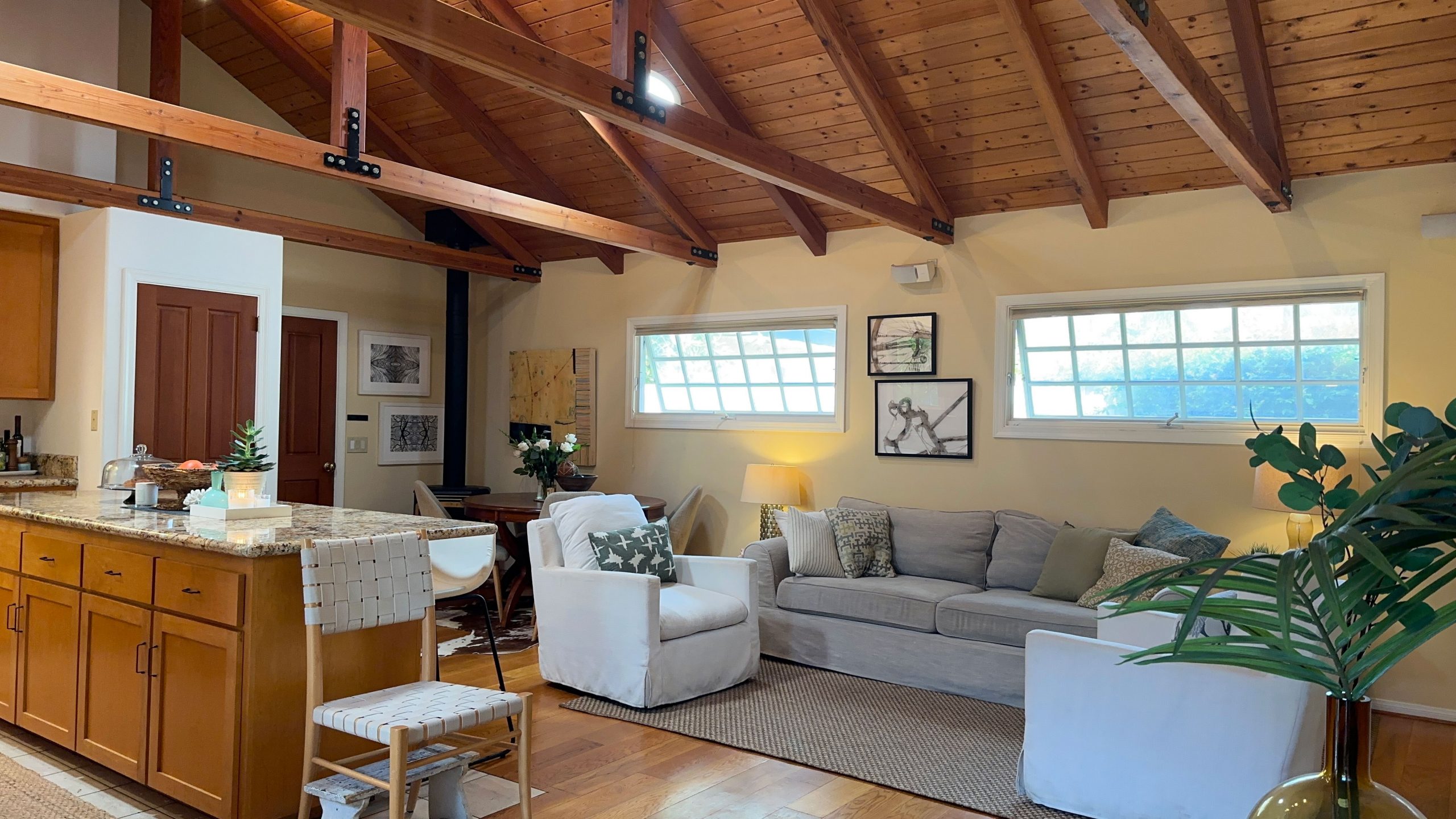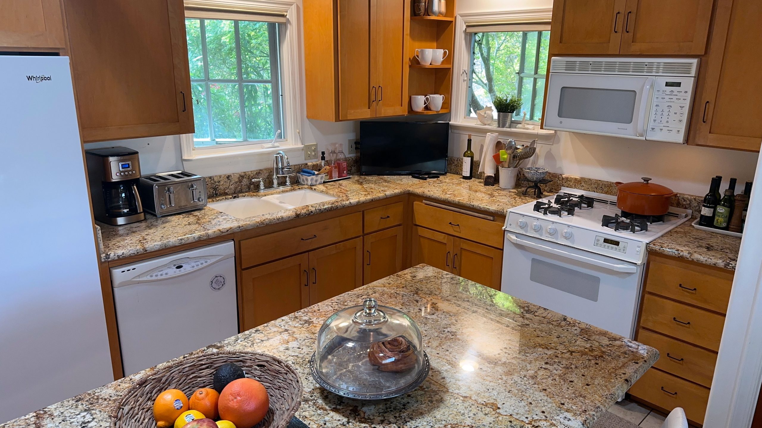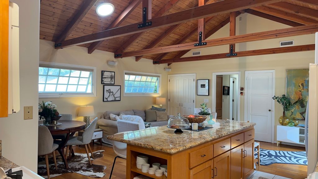 In the main room, you’ll find the kitchen equipped with everything you need for meal preparation. A new refrigerator, a gas range/oven, a microwave, ample counter space, and essential cookware make cooking a joy. The large, rectangular center island provides a convenient workspace and gathering spot, perfect for enjoying casual meals or mingling with friends and family while whipping up your favorite dishes.