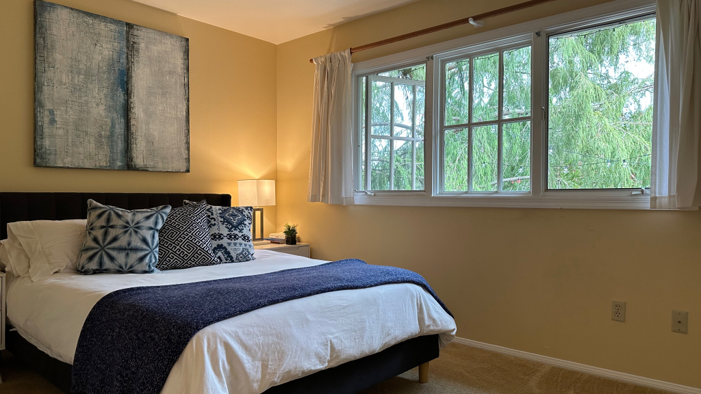 The cozy master bedroom is a serene sanctuary featuring a comfortable king-sized bed adorned with soft linens and pillows. This bedroom offers a tranquil escape, perfect for unwinding with a good book or binging your favorite television show. Attached to the bedroom, is an ensuite bathroom, providing added convenience.